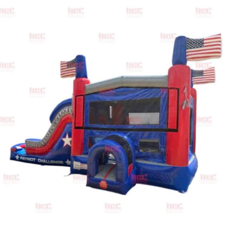 The Patriot Challenge Dual Combo is a patriotic-themed inflatable rental built for active fun, with a bold red, white, and blue look that stands out at parties, school events, festivals, and backyard celebrations. As a dual combo unit, it typically gives guests more than one way to play, combining a bounce area with extra features like climbing, sliding, or side-by-side action that keeps the energy moving and makes it great for groups. The “challenge” style suggests a more interactive setup than a basic bounce house, so it’s a strong choice for kids and teens who want to jump, race, and stay engaged. It works well for events that want a festive American theme and a lively centerpiece that feels exciting, colorful, and easy to enjoy.